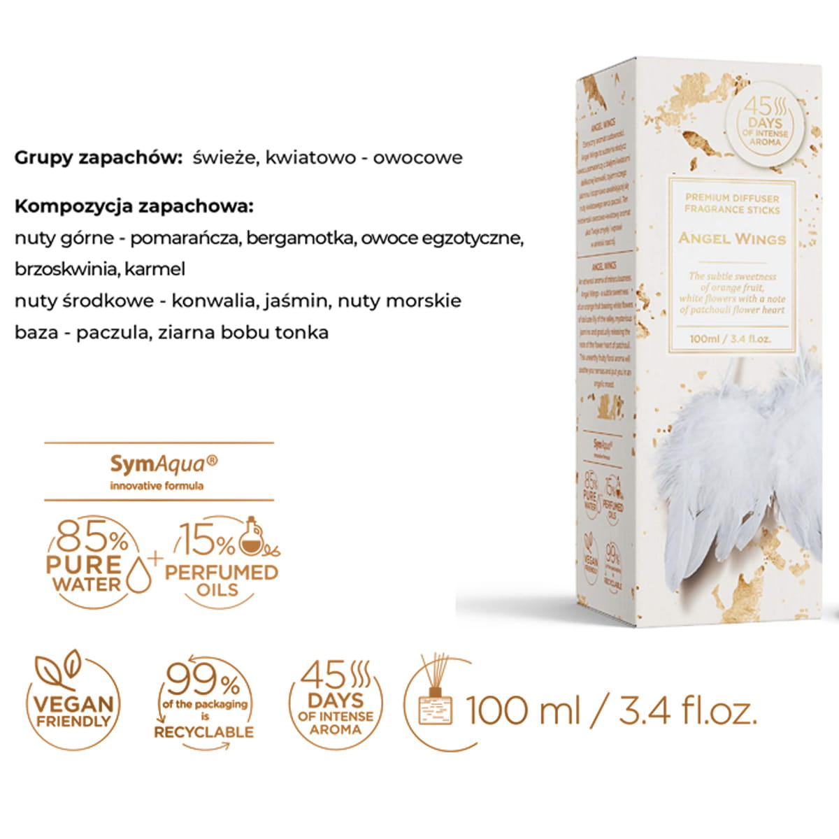 * mieszanka zapachu- słodki zapach pomarańczy, białych kwiatów z nutą paczuli