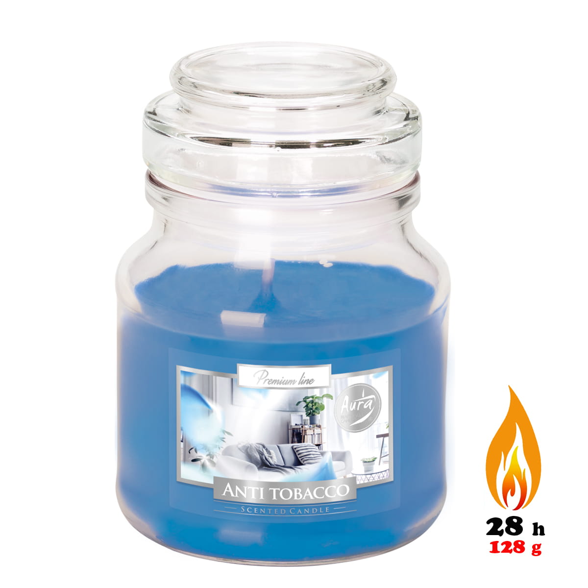 Świeca zapachowa ANTYTABAK w słoiku z wieczkiem, o czasie spalania 28h.