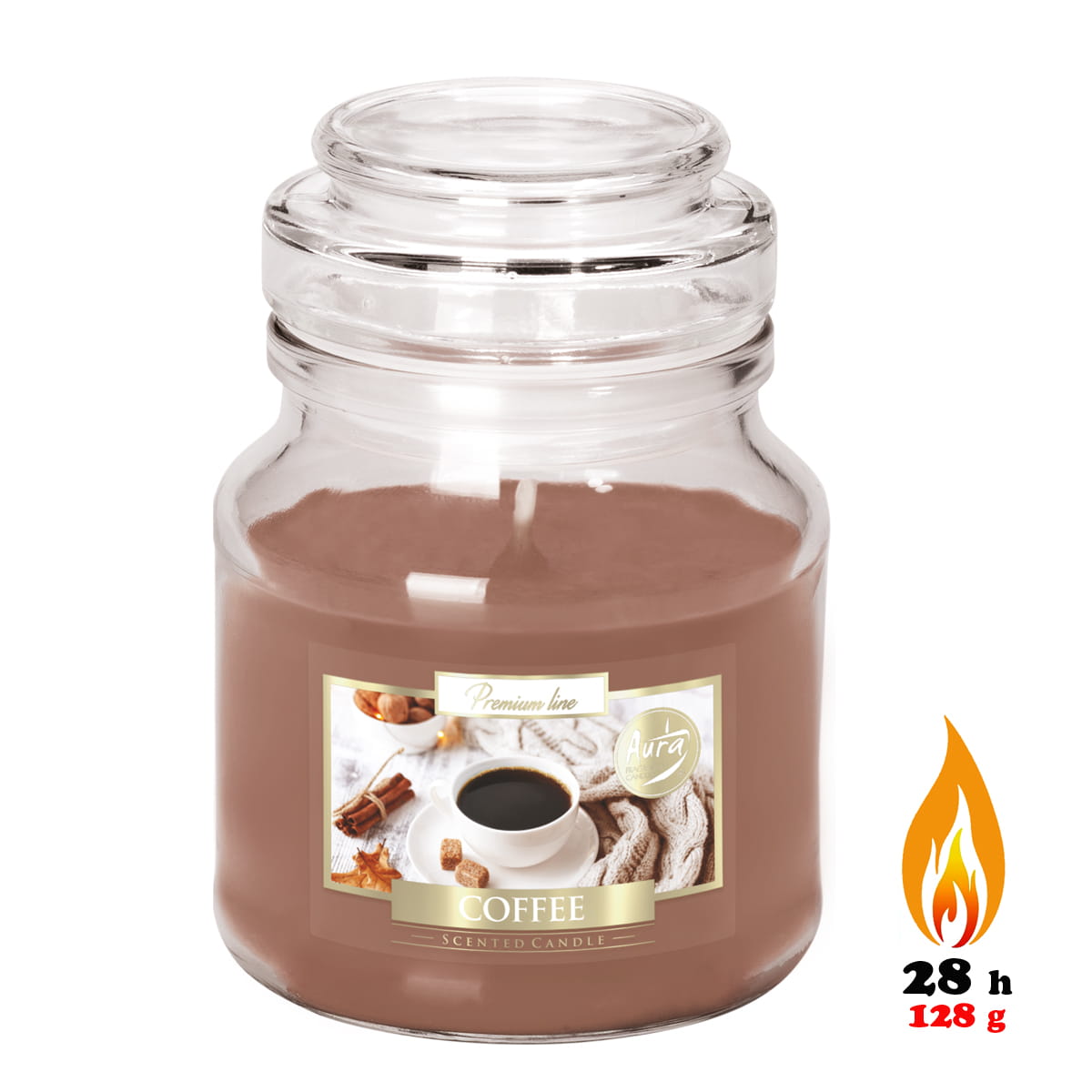 Świeca zapachowa KAWA w słoiku z wieczkiem, o czasie spalania 28h.
