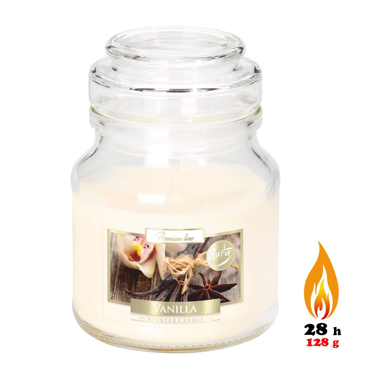 Świeca zapachowa WANILIA w słoiku z wieczkiem, o czasie spalania 28h.