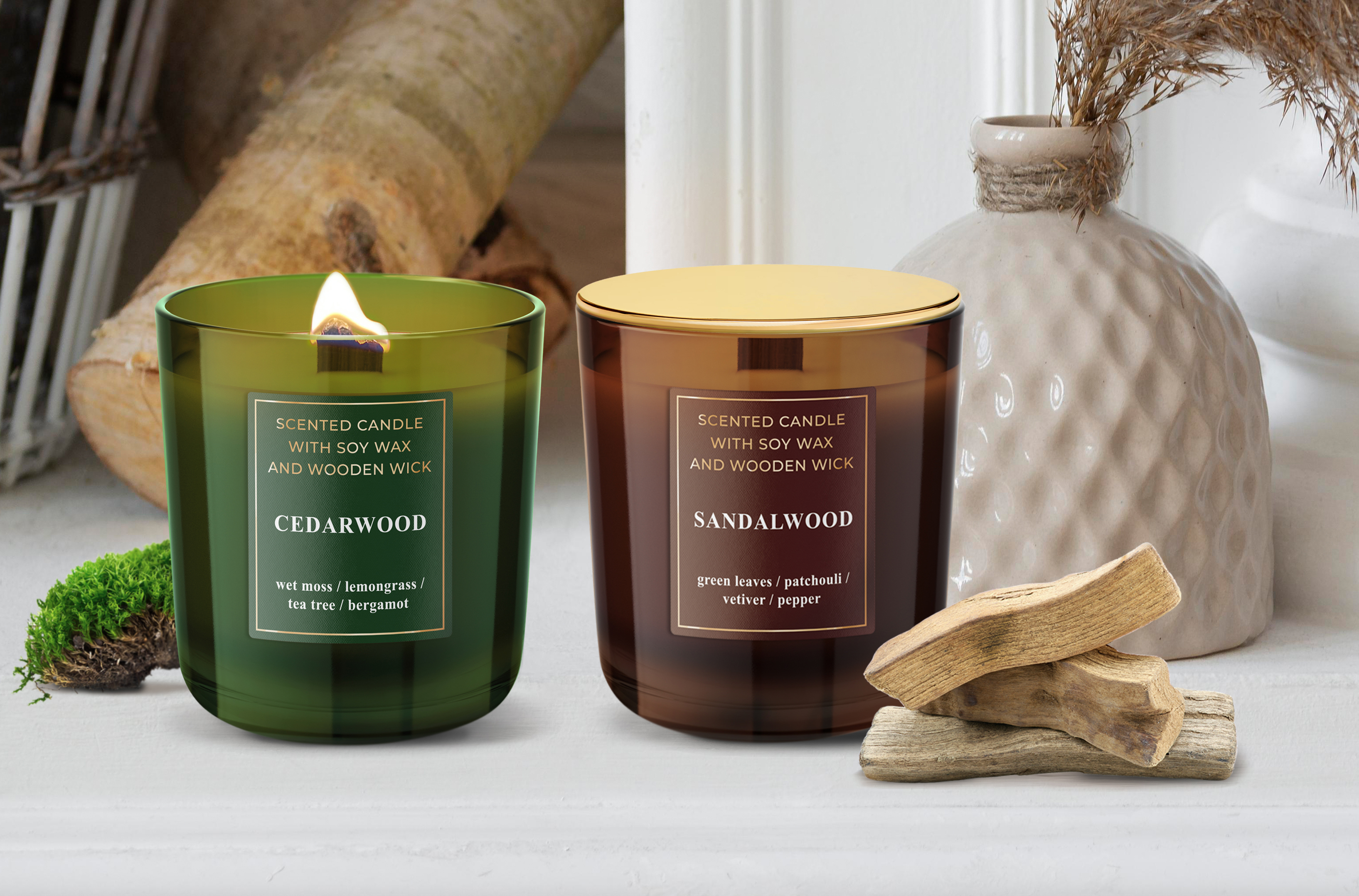 Kolekcja świec WOOD to połączenie magii płomienia i dwóch zachwycających, drzewnych kompozycji zapachowych. Płomień z drewnianego knota tworzy magiczną atmosferę. Czasem zaiskrzy i syknie niczym drewno palone w kominku. Świece zawierają wosk sojowy, dzięki czemu zapewniają głębię zapachową i trwałość aromatu.