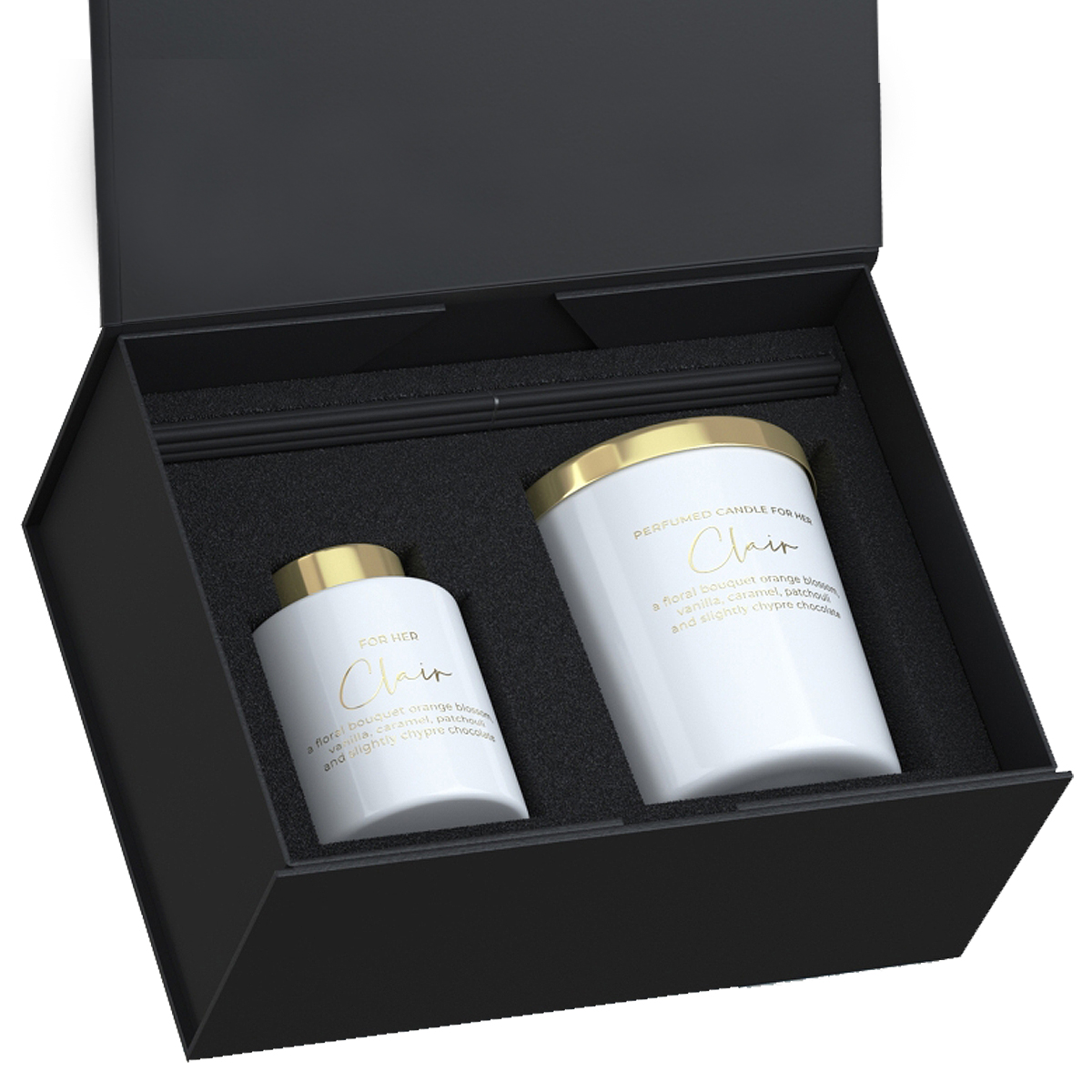 Zestaw Prezentowy Świeca Parafinowa z bawełnianym knotem i Dyfuzor Zapachowy zapakowane w eleganckie pudełko z zapięciem magnetycznym.