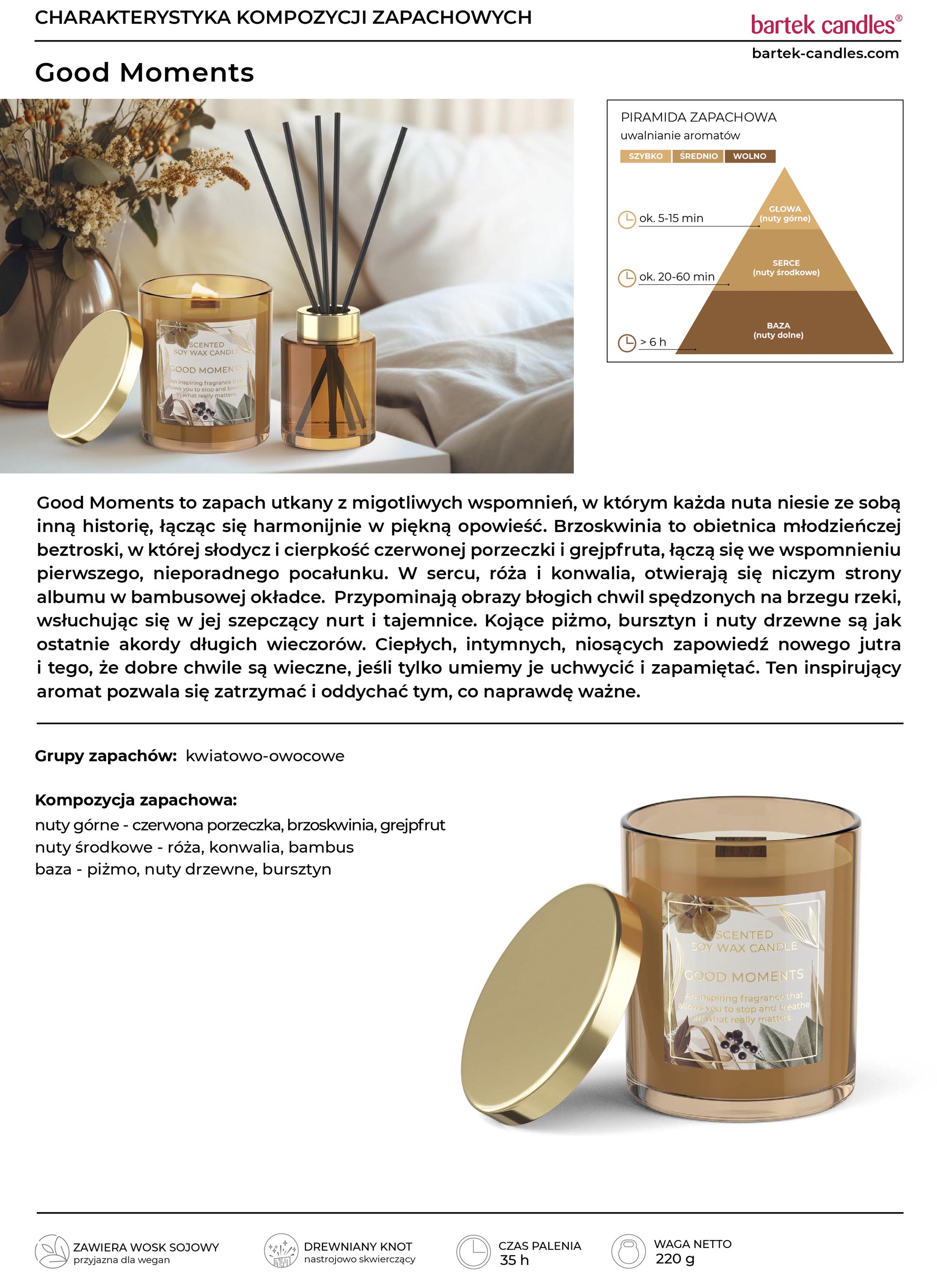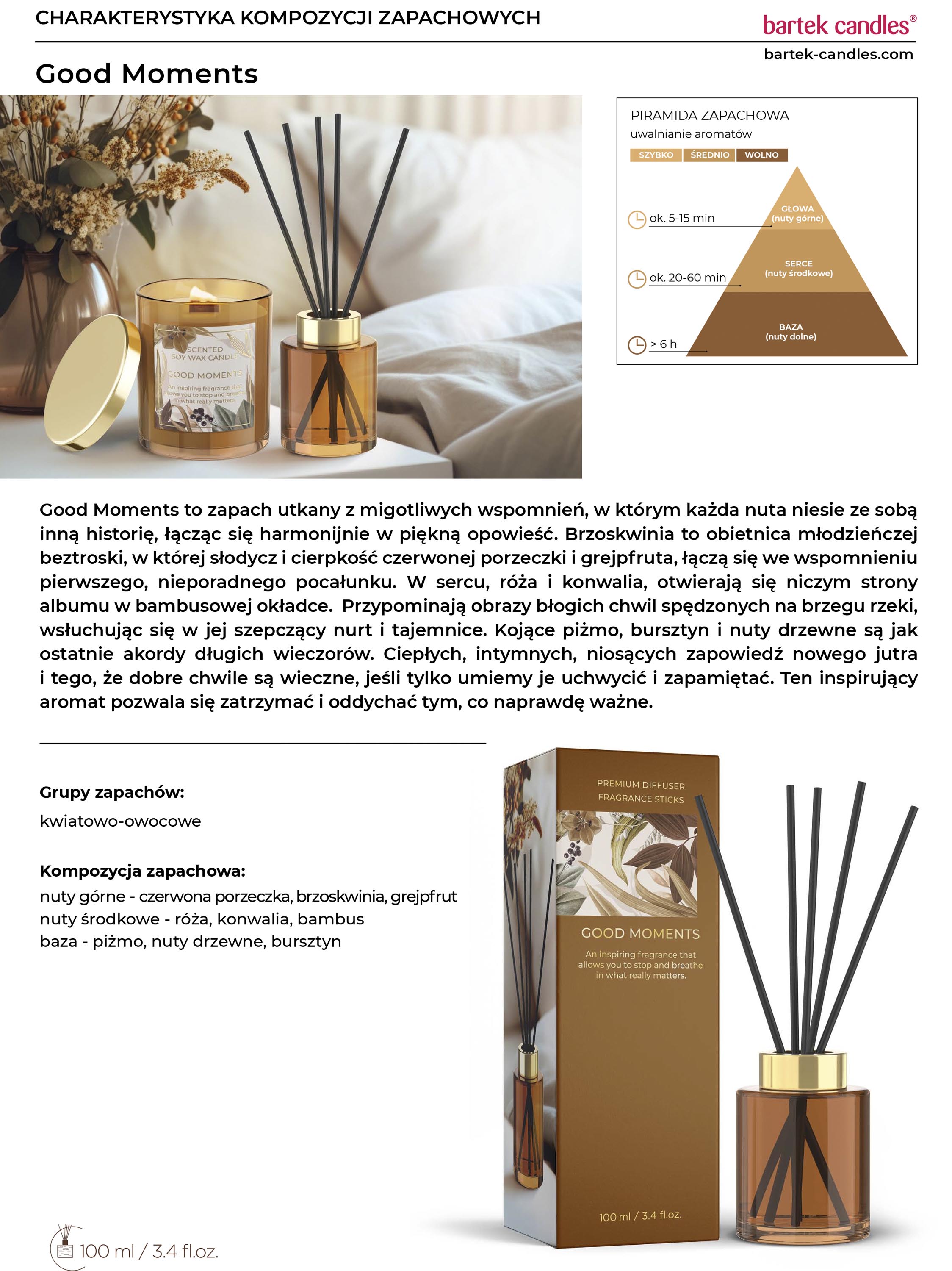 Good Moments to zapach utkany z migotliwych wspomnień, w którym każda nuta niesie ze sobą inną historię, łącząc się harmonijnie w piękną opowieść. Brzoskwinia to obietnica młodzieńczej beztroski, w której słodycz i cierpkość czerwonej porzeczki i grejpfruta, łączą się we wspomnieniu pierwszego, nieporadnego pocałunku. W sercu, róża i konwalia, otwierają się niczym strony albumu w bambusowej okładce. Przypominają obrazy błogich chwil spędzonych na brzegu rzeki, wsłuchując się w jej szepczący nurt i tajemnice. Kojące piżmo, bursztyn i nuty drzewne są jak ostatnie akordy długich wieczorów. Ciepłych, intymnych, niosących zapowiedź nowego jutra i tego, że dobre chwile są wieczne, jeśli tylko umiemy je uchwycić i zapamiętać. Ten inspirujący aromat pozwala się zatrzymać i oddychać tym, co naprawdę ważne.
