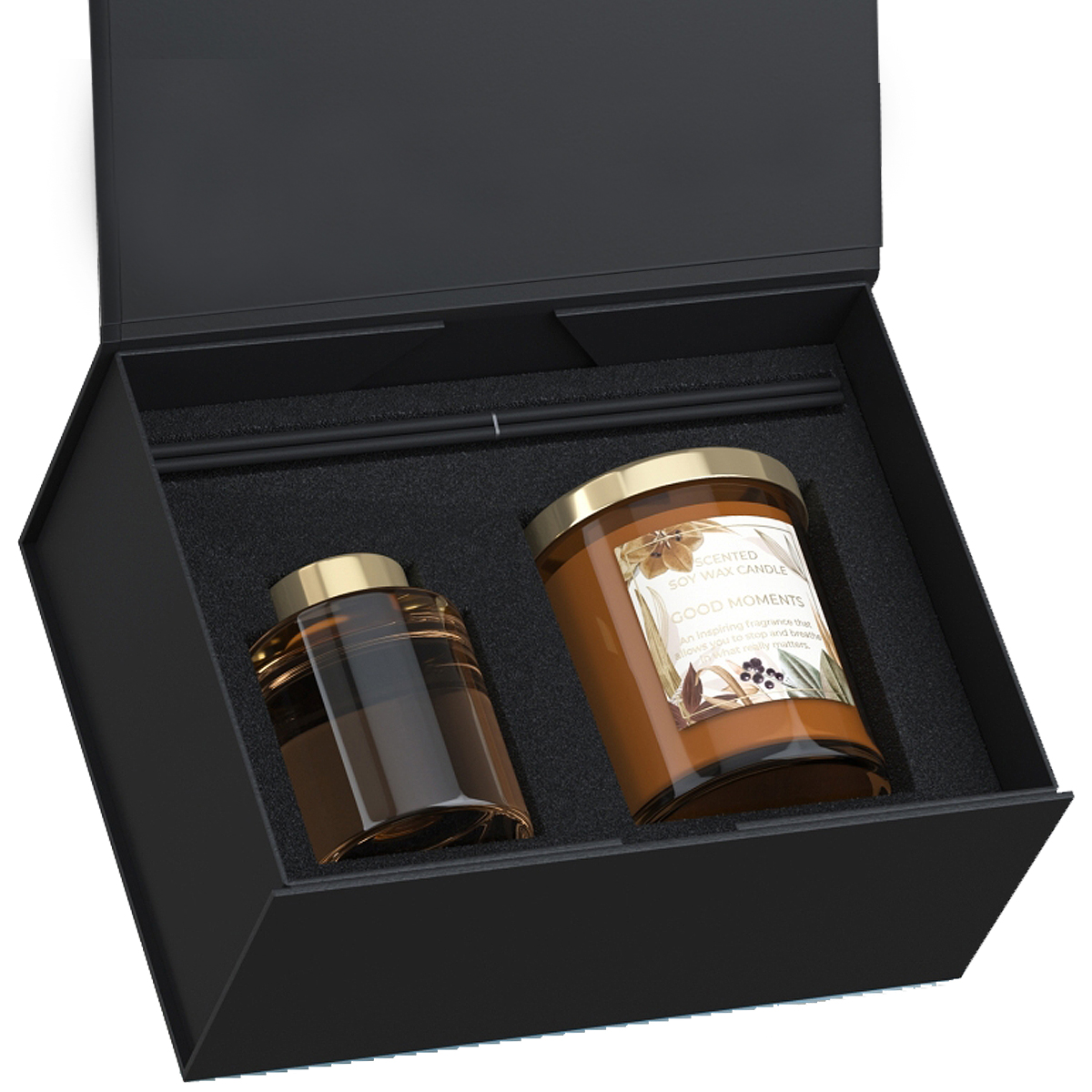 Zestaw Prezentowy Świeca Sojowa z drewnianym knotem i Dyfuzor Zapachowy zapakowane w eleganckie pudełko z zapięciem magnetycznym.