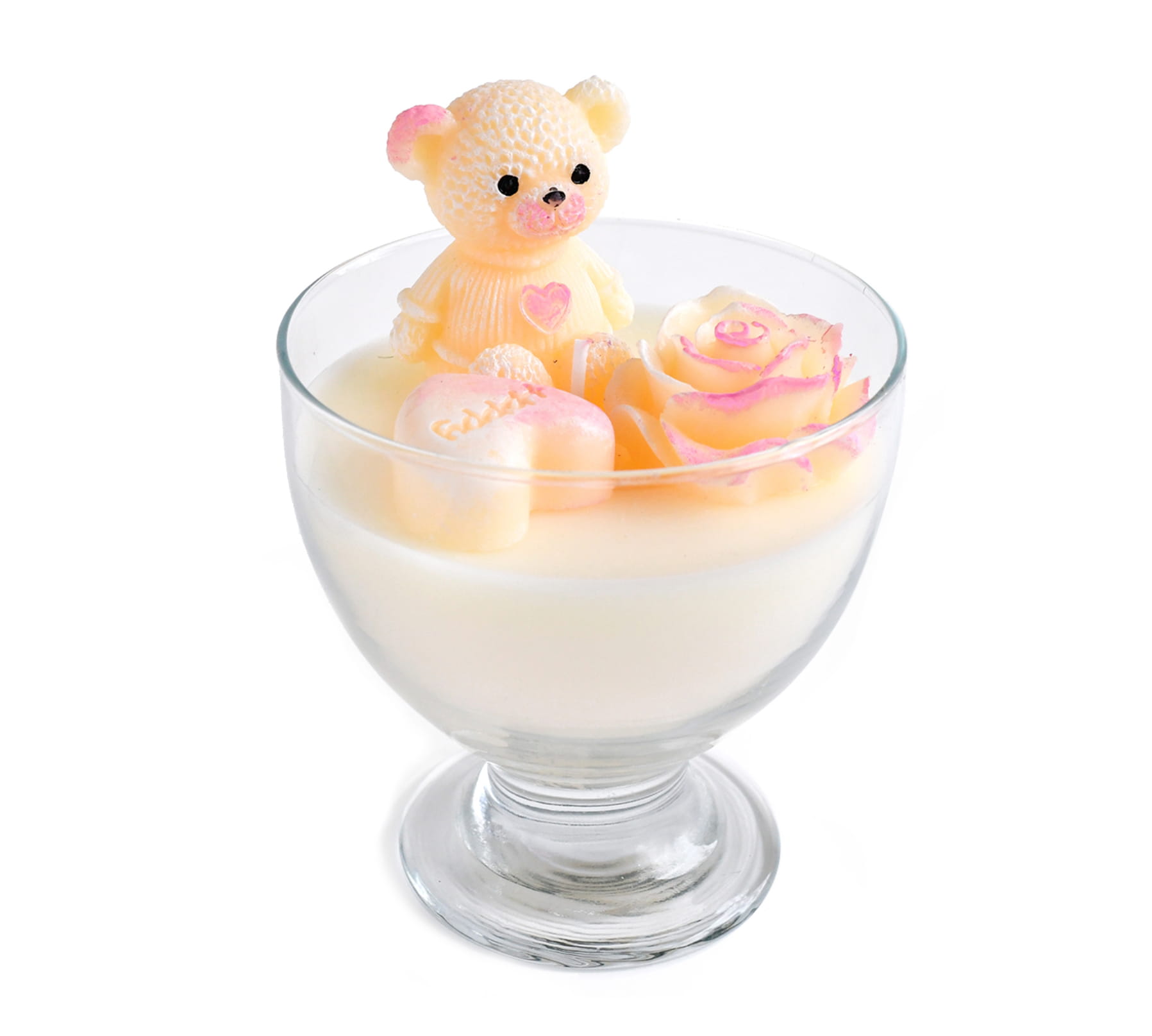 Urocza świeca dekoracyjna przedstawiająca misia zanurzonego w szklanym pucharku.