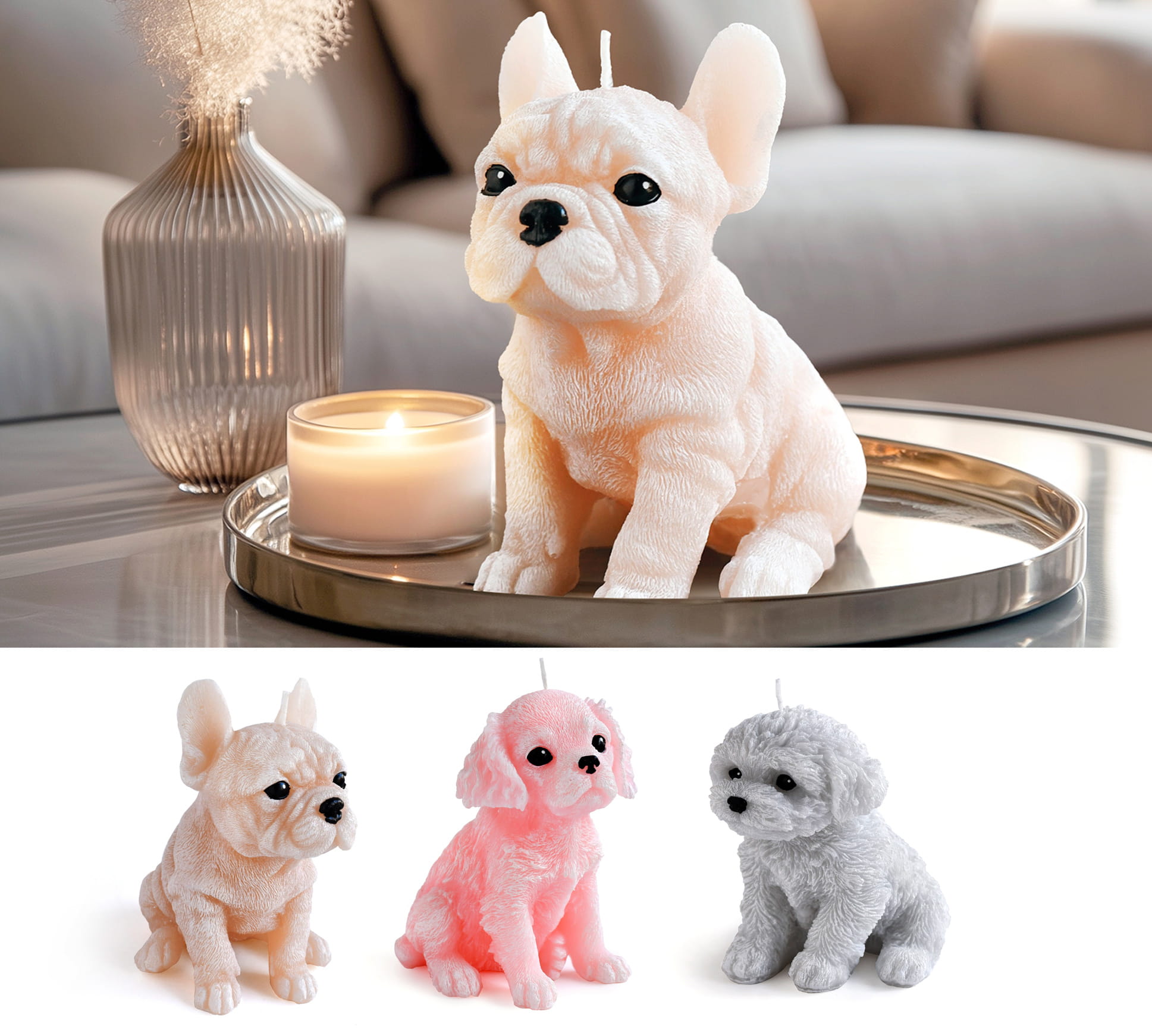 Urocza świeca dekoracyjna w kształcie pieska – idealna dla miłośników zwierząt i oryginalnych dodatków do wnętrz. Wykonana z parafiny, dostępna w kilku delikatnych, pastelowych kolorach (beż, szarość, krem )